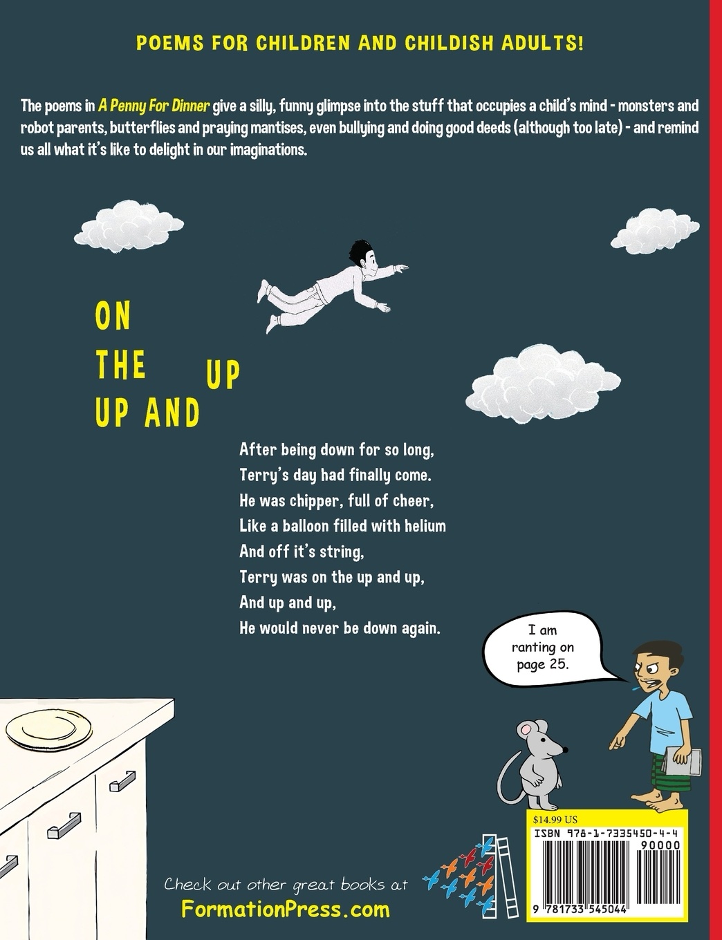 The poems in A Penny for Dinner give a silly, funny glimpse into the stuff that occupies a child’s mind – monsters and robot parents, butterflies and ladybugs, even bullying and doing good deeds – and remind us all what it’s like to delight in our imaginations.